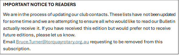Member birthdays for July: John Oswald 7th July Philip Beasley 7th July Daryl Lee 17th July Sue Currie 21st July Linda Neale 27th July Ben Smith 30th July Date joined Rotary Richard Hawker 2nd July 1980 - 45 years - WOW WEE! Tom Fratantaro 3rd July 1987 - 38 years Martin Duke 4th July 2021 - 4 years Sue Currie GAIL BIRCHALL (sorry to Sue and Gail) 7th July 2024 - 1 year and counting